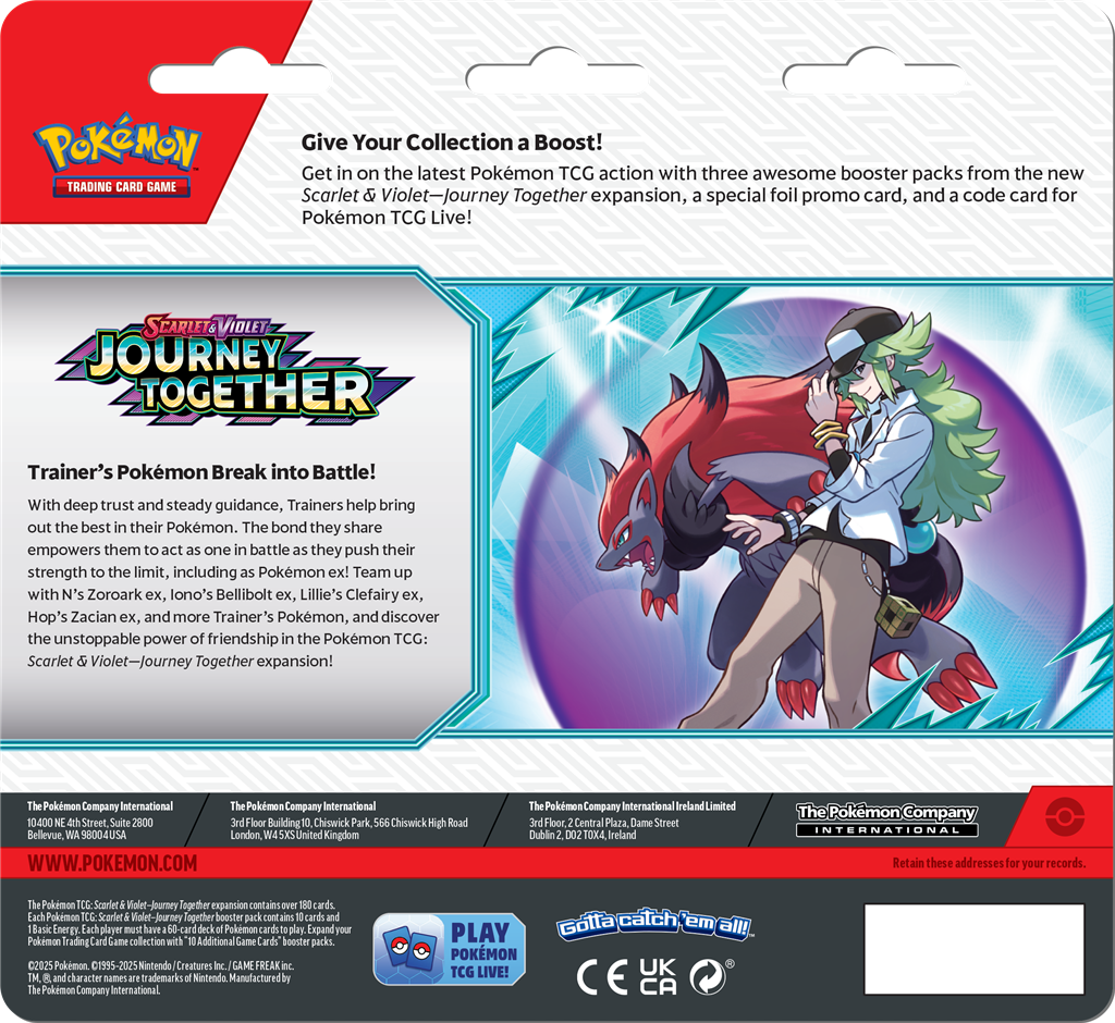 The bond they share allows them to act as one in battle as they push their powers to the limit. including as Pokémon ex! Team up with N’s Zoroark ex. Iono’s Bellibolt ex. Lillie’s Clefairy ex. Hop’s Zacian ex. and more Trainers’ Pokémon. and discover the unstoppable power of friendship in the Pokémon TCG: Scarlet & Violet—Journey Together expansion!
