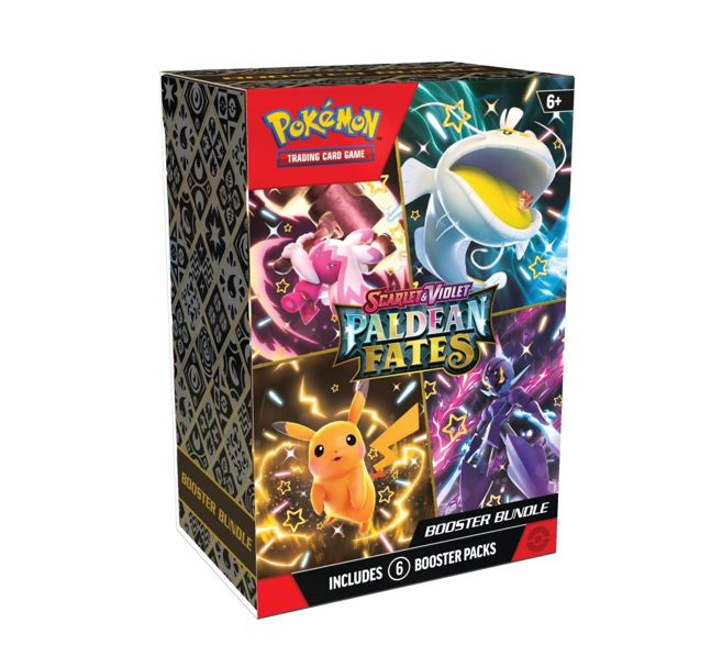 Een booster bundle bevat 6 boosterpacks van Scarlet & Violet Paldean Fates. Iedere Scarlet & Violet Paldean Fates boosterpack bevat 11 Pokémon kaarten