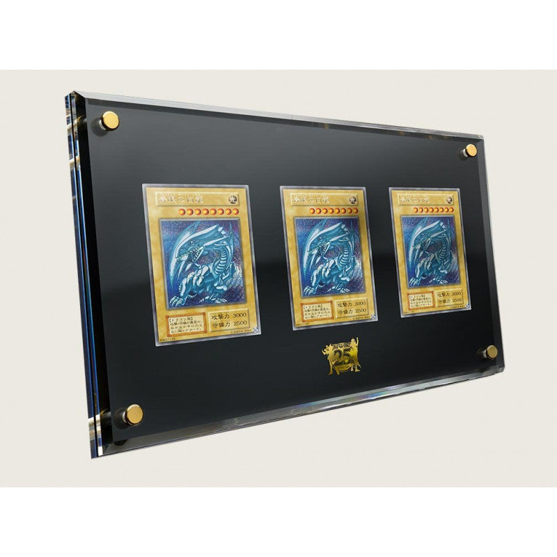 3 x Blue Eyes White Dragon cards with a special 25th anniversary symbol.